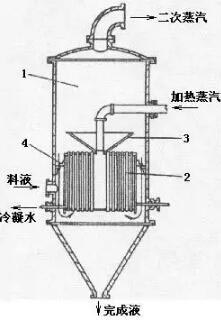 由于在循環(huán)管與加熱管中液體的密度不同。所以物料循環(huán)產(chǎn)生液體,在蒸發(fā)器內(nèi),溶液是由加熱管往上走。受熱以后達(dá)到沸騰。溶液沸騰后產(chǎn)生的二次蒸氣經(jīng)分離器與除沫器由頂部排出。液體則經(jīng)中央循環(huán)管下降。降至蒸發(fā)器底的液體又沿加熱管上升。如此不斷循環(huán)。溶液的循環(huán)速度也不斷加快。可達(dá)0.1~0.5 m/s。因而可以提高蒸發(fā)器的傳熱系數(shù)與生產(chǎn)強(qiáng)度。此種蒸發(fā)器適用于黏度大的溶液和易結(jié)垢或結(jié)晶的溶液。
